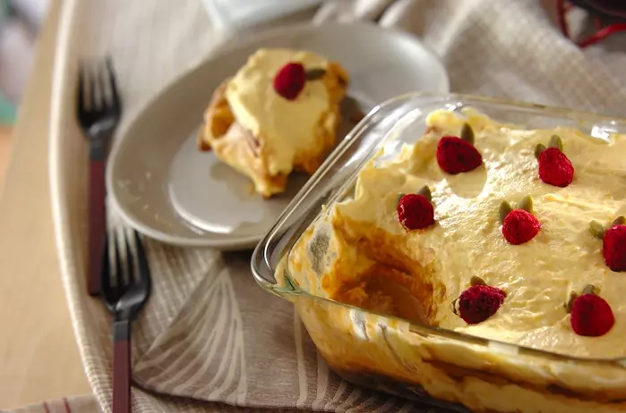 大きな器で豪快に盛り付ければ、混ぜて重ねるだけでパーティー映えするおもてなしティラミス。カボチャの優しい甘さがうっとりする美味しさ。カボチャは栄養価が高いのでお子さんにもオススメのスイーツです。