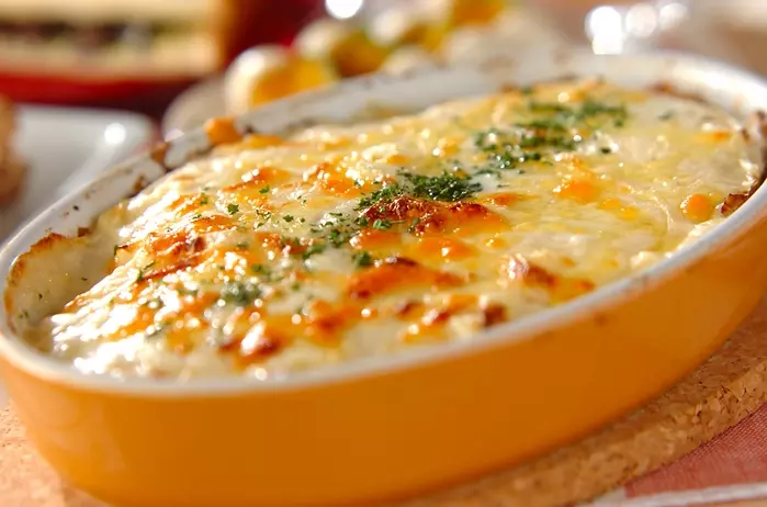 具材を重ねてチーズをかけるミルフィーユ式のグラタンはマカロニを入れるとボリュームアップ。キャベツは千切りにしても良いですね。