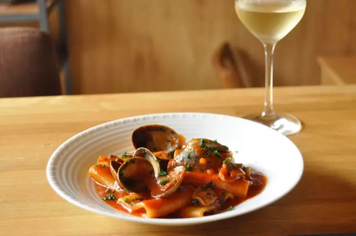 モッチリと弾力のあるパッケリにしみこんだ濃厚ソース「ボンゴレロッソ」【ワインと料理 ペアリングの愉しみ】