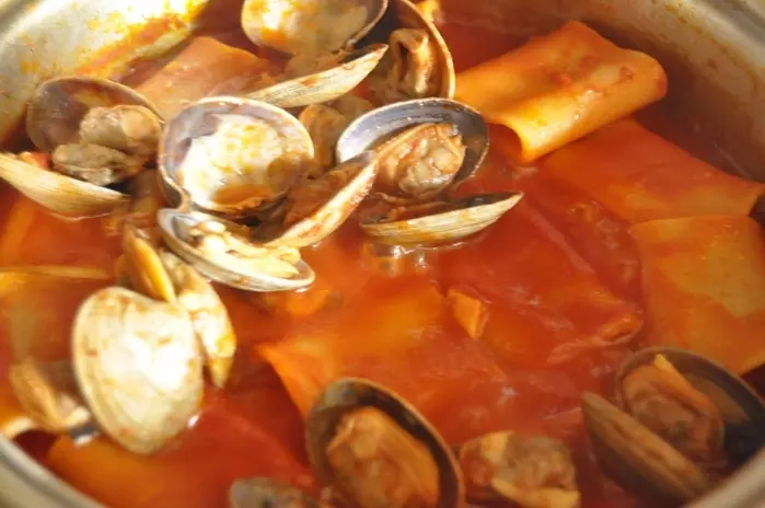 3、貝が開いたらアサリをいったん取り出し、ソースが残ったフライパンにパッケリを加える。アサリは約半量を殻から身を外す。