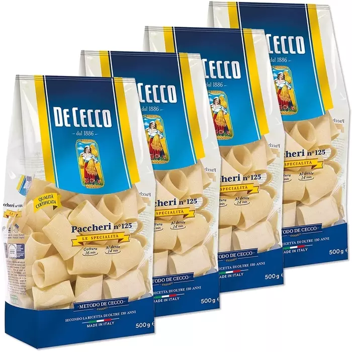 ディ・チェコ No.125 パッケリ 500g ×4袋南部イタリアの大きなチューブ形状のショートパスタです。濃厚な肉のラグーソースがお勧めです。ナポリなどでは具材を詰めて使われることもあります。標準ゆで時間:16分