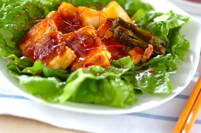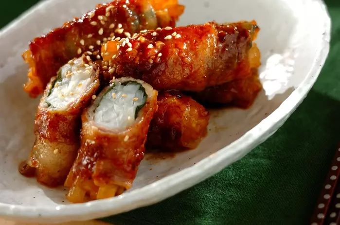 豚肉で巻いたお餅と韓国風の特製ダレがマッチ! 力がつきそうなボリューム満点の料理です。