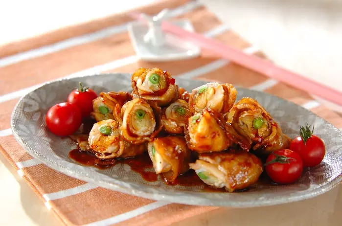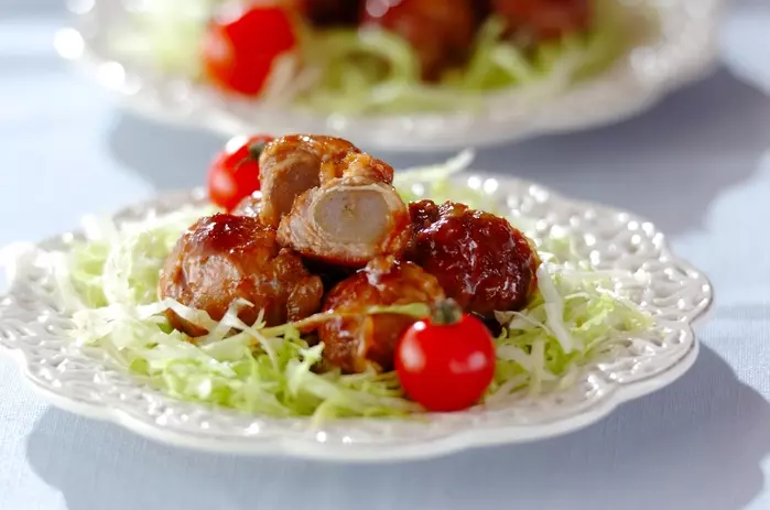 一見肉団子のように見える、肉巻き。カサ増し&ヘルシーに仕上がった一品は、こんにゃくのしっかりした食感が食べ応え抜群です。ダイエット中の方もストレスフリーで食べられます。