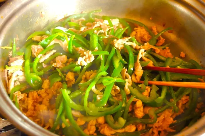 Point:ピーマンは食感を残すためにシャキシャキ感が残る程度で取り出してください。