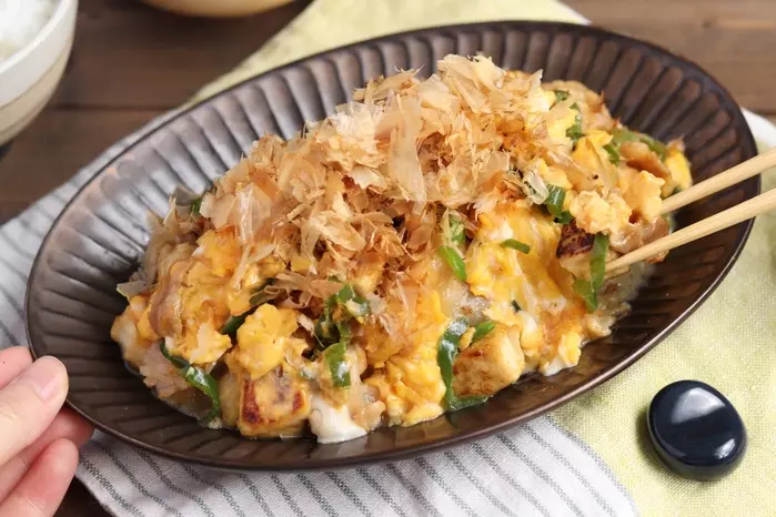 4、卵が半熟になったら火を止め、お皿に盛りつける。かつお節をトッピングして完成。