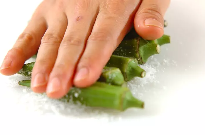 オクラには小さな産毛があります。まな板に塩を敷いて、その上にオクラを並べ擦るようにして産毛を落とします。