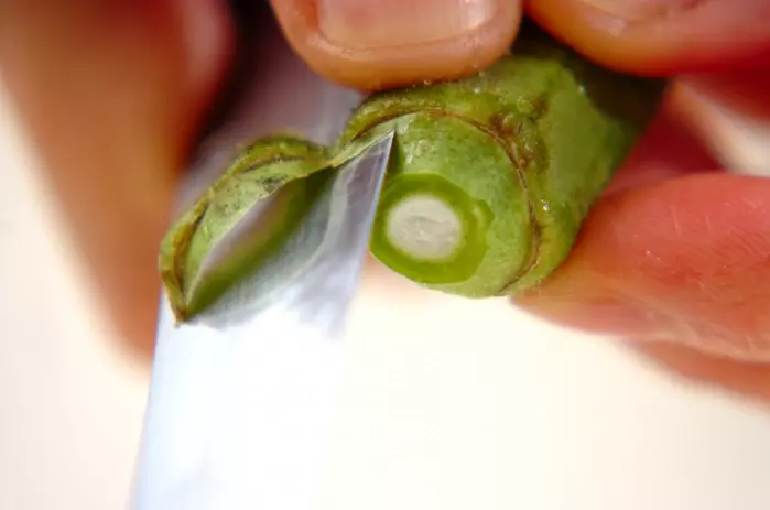 オクラのヘタの部分には苦味があります。包丁で周りの角をぐるっと削るように包丁で取っていきます。
