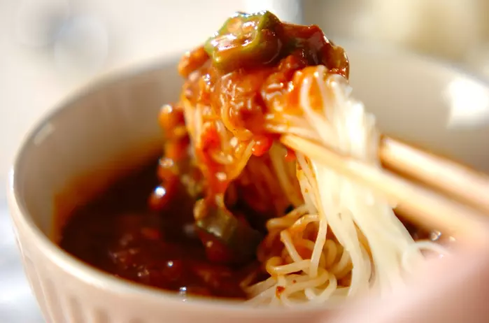 オクラと納豆のネバネバを利用して細い麺に絡みつく味わいがたまらないつけ麺。隠し味に市販のミートソースを使うので、実はとっても簡単。トマトの酸味とカレーの香辛料がいい塩梅で食がすすみます。