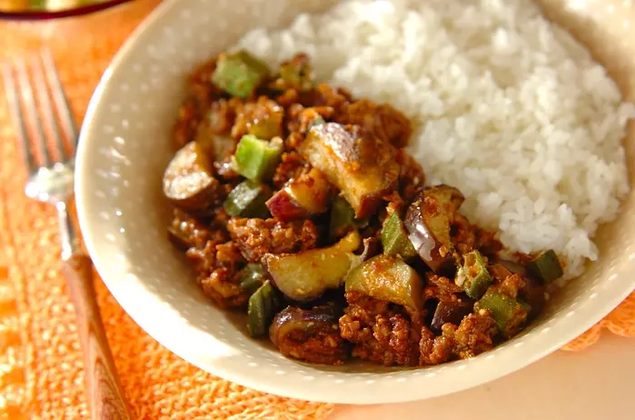 オクラの粘り気を利用した、汁気少な目のドライカレーのようなカレーライスが完成しました。材料は少ないのに栄養価が高く食べやすい夏カレーです。