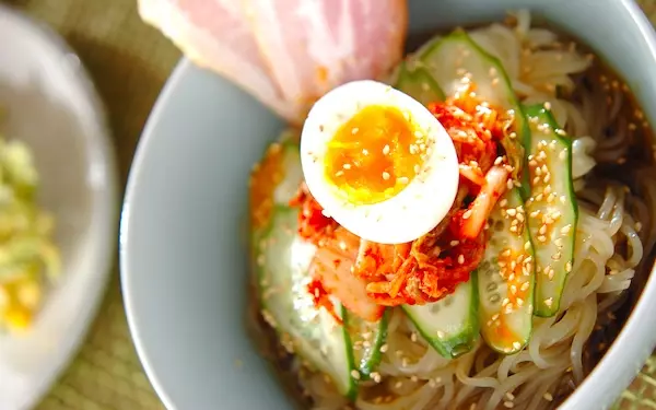 さっぱりとした甘酸っぱいスープが食欲をそそる冷麺です。お好みでラー油をかけて召し上がれ。夏の暑い時期に最適です。