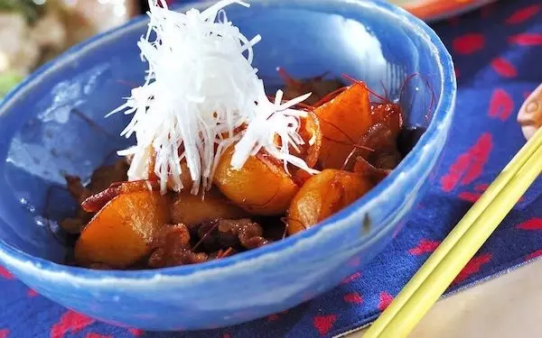 豆板醤入りのピリ辛肉じゃが。仕上げに、白髪ネギと糸唐辛子を上に飾りましょう。ご飯とはもちろん、お酒との相性も抜群です。
