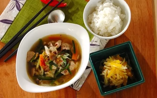 1人303kcalの献立です。煮干しは水に浸して数時間置くだけでだしが出ます。味付けはキムチで簡単に! 野菜と春雨を使い、ダイエット中でも満足できるボリュームです。