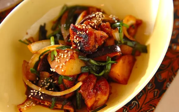 韓国風の鶏焼き肉「ダッカルビ」は、甘辛い味付けでご飯がもりもり進みます。ジャガイモ入りでボリュームもあり、お弁当のおかずにもオススメ。