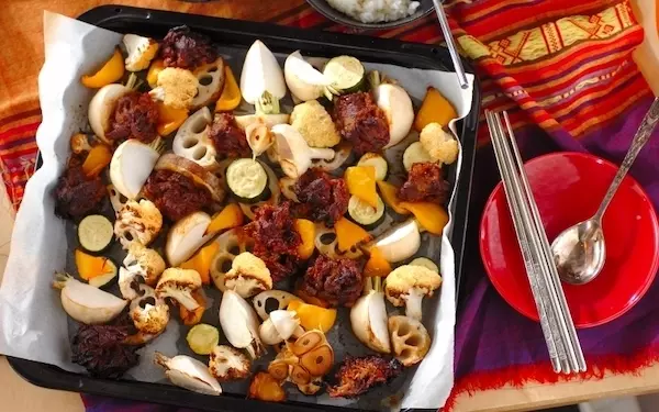 天板に材料をのせて焼くだけでできる「ぎゅうぎゅう焼き」。コチュジャンで下味をつけた牛肉がご飯によく合います。野菜とお肉をたっぷり味わえて大満足できますよ。