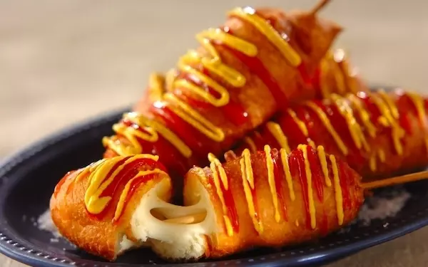SNSで人気のハットグ(韓国風アメリカンドッグ)も自宅で作れます。アツアツを頬張って、家族みんなで伸びるチーズを楽しんでくださいね。おやつにもピッタリです。