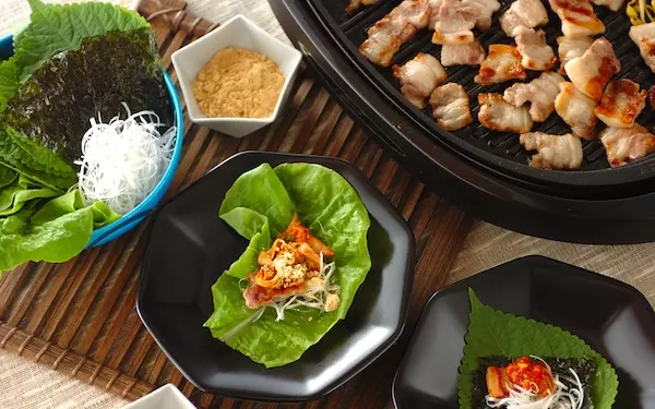 豚バラ肉を使った焼き肉「サムギョプサル」は人気の韓国料理です。とびきり美味しい手製の「サムジャン」のほか、タレやトッピングを組み合わせて、本場の味をご賞味ください。