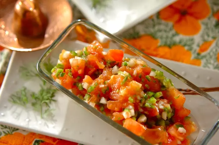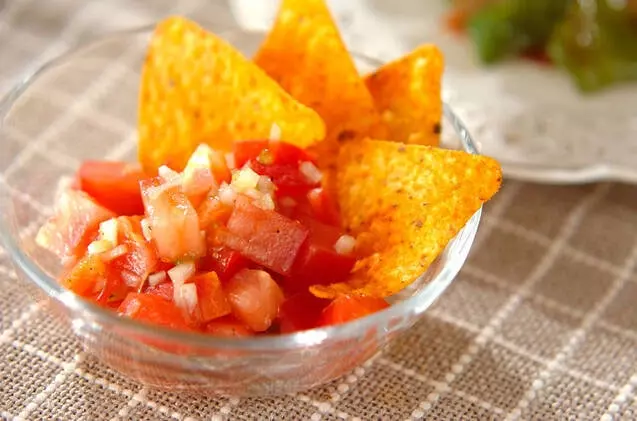 トマトと玉ネギを和えた、さわやかな一品。トルティーヤチップにのせて召し上がれ。