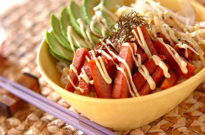 こんがり焼いたポークランチョンミートとアボカドの相性は抜群です。おうちでカフェ気分を味わえるおしゃれな丼です。マイルドな「リチャム」はカフェ丼にぴったりです。