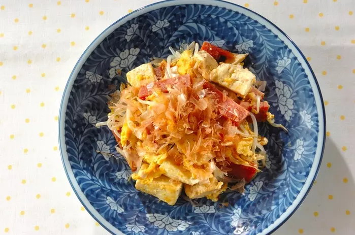 さっぱり目の「リチャム」は炒め物の塩加減も好みに合わせられるところが◎。コンビニで手に入るモヤシ、豆腐、卵をポークランチョンミートと合わせたチャンプルはボリュームがあり白いご飯によく合います。忙しい日はご飯に乗せて丼にしてもいいですね。