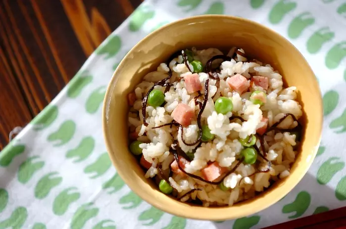 ■グリーンピースとポークランチョンミートの混ぜご飯