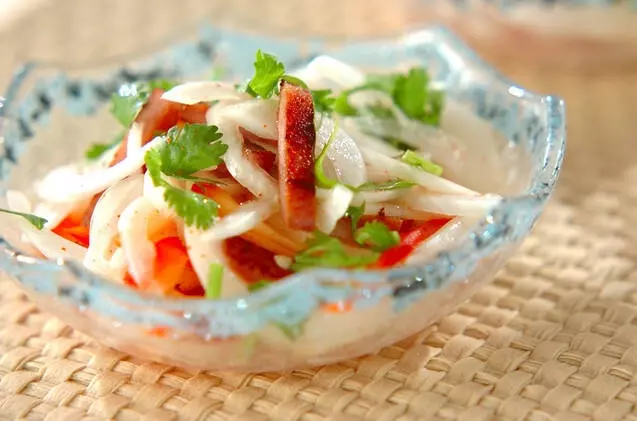 ナンプラーを効かせたエスニックなサラダ。「リチャム」の品の良い塩味がエスニックテイストに馴染みます。生春巻きの皮で巻いても美味しく食べられます!暑い夏にピッタリの簡単レシピ。