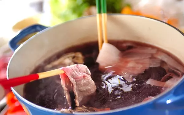 赤ワインのスープで肉や野菜をしゃぶしゃぶする、いつもとひと味違う変わり鍋です。〆はお米を入れてリゾットに。ホームパーティーにも最適です。