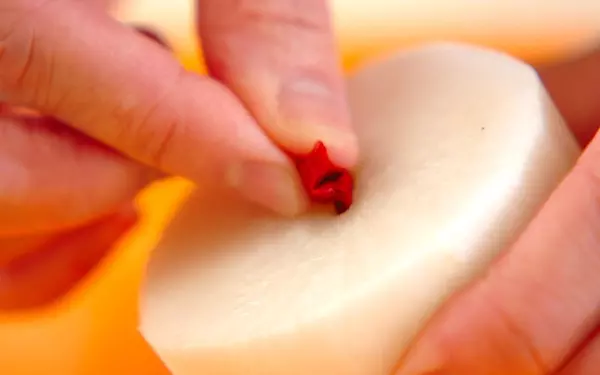 ・<紅葉おろし>を作る。赤唐辛子のヘタを取って種を取る。大根の皮をむき、菜ばしで1~2ヶ所穴をあけ、赤唐辛子を穴に差し込んで、差し込んだ側から、すりおろして紅葉おろしにする。