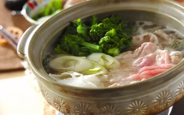 季節の野菜を入れた豚しゃぶしゃぶです。菜の花で春らしさを感じます。夏はレタスやトウガン、ナス、秋はキノコ類や水菜、冬は白菜やカブなどを入れて、季節感満載の鍋に仕上げましょう。