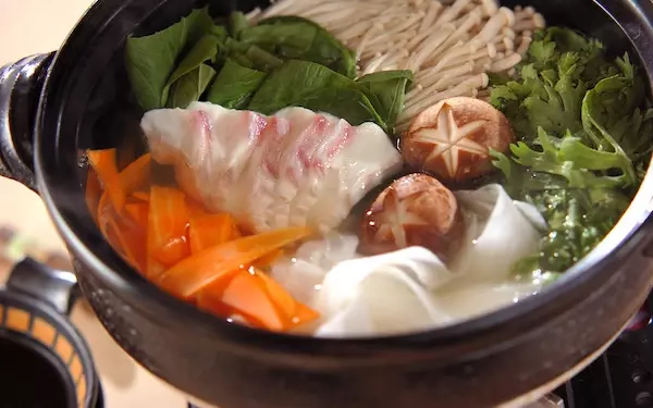 昆布でとっただしに、野菜と鯛を入れてポン酢ダレでいただきましょう。鯛はサッと火を通す程度がベスト。お好みで、七味唐辛子を振ってくださいね。