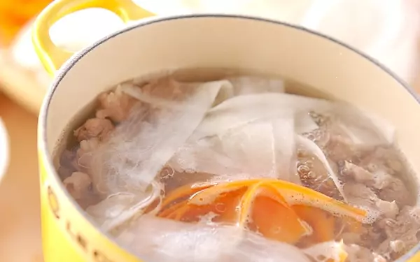 大根をたっぷりと食べられるヘルシーなお鍋です。牛すじ肉の旨味がしみ出たスープを使って、〆に雑炊を作るのもオススメ。残ったスープは、味噌汁のだし汁としても活躍してくれます。