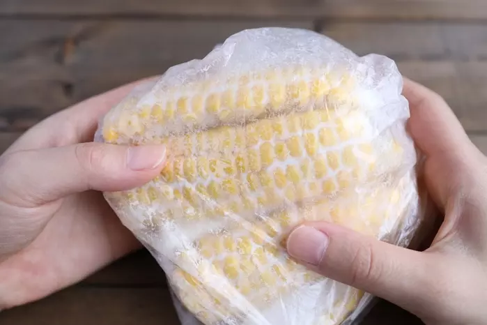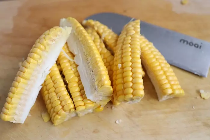とうもろこしは皮を剥き、ラップに包んで600Wで2分加熱する。