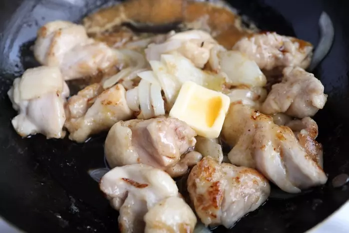 「鶏とカリカリとうもろこしのバター醤油炒め」