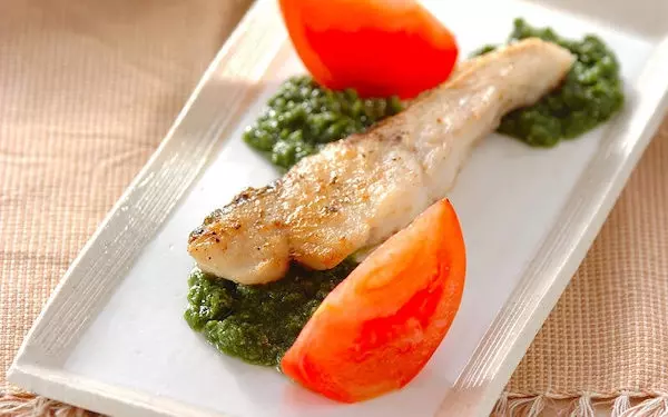 バジルソースは魚のムニエルの旨味を引き立てます。器にバジルソースを敷き、タラのムニエルを盛ってトマトを添えれば完成です。魚は、鮭・カレイ・舌平目などを使っても◎。