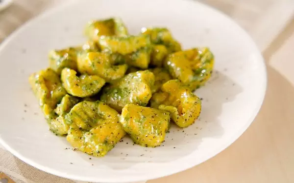 ニョッキ好きなら、ぜひ試したいのがこちらのレシピ。カボチャの優しい甘みと粉チーズの塩気、バジルペーストの良い香りが混ざり合った、やみつきニョッキです。仕上げにお好みで、粗びき黒コショウを振ってくださいね。