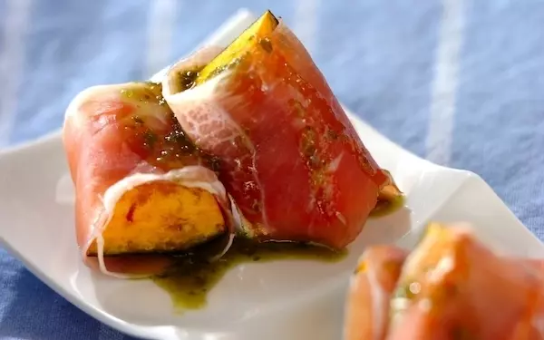 揚げたカボチャを生ハムで巻き、器に盛ってからバジルソースをかけたユニークな料理です。前菜としてはもちろん、ワインとのペアリングもオススメ。ハンバーグなどのサイドディッシュにもぜひ!