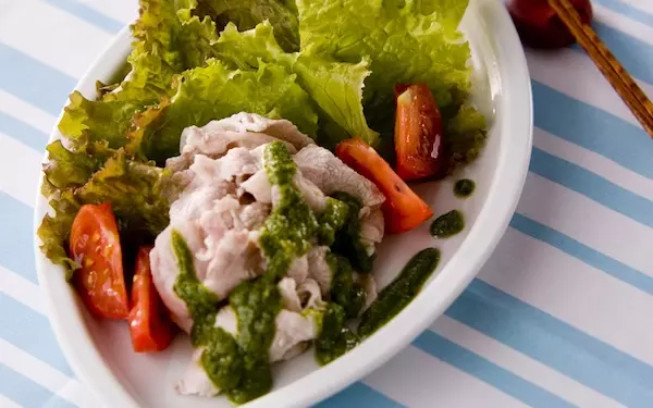 冷しゃぶをバジルソースで食べるのも乙なものです。生野菜もいっぱい盛りつけて、一緒にいただきましょう。お肉と野菜をペロリと味わえて、美味しくお腹を満たすことができますよ。