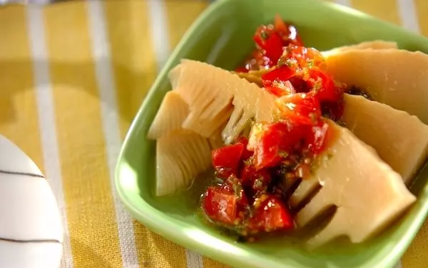 水煮タケノコにバジルソースをかけたカルパッチョです。前日に、スープに浸けた水煮タケノコを冷蔵庫に1晩置き、マリネにします。タケノコのシャキシャキ食感とバジルの良い香りのコラボがくせになりそうです。