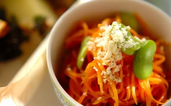 ちょっと気になるパスタのカロリーも、キャロットパスタなら心配無用です。仕上げにお好みで、粉チーズを振ってからいただきましょう。ニンジンとそら豆、バジルソースの美味しいハーモニーを楽しめますよ。