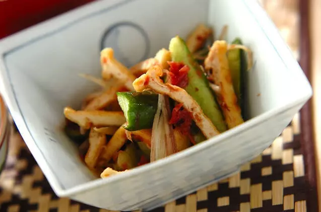 すりこぎでたたいたキュウリは、合わせ梅ダレとよくからんでおいしい!口の中がサッパリとする一品です。キュウリとミョウガは油揚げと相性抜群。コスパの良いレシピです。