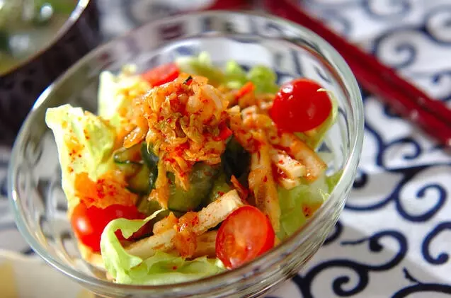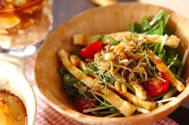 表面をカリッと焼いた油揚げが、パリパリとした食感で香ばしい、エスニック風サラダです。白菜キムチのピリッとした辛さが良く合います。野菜たっぷりで食べ応えのあるサラダです。