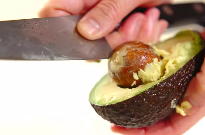 縦に切り目を入れて両手でくるっと回すと半分に分かれます。タネは包丁の角を刺して回しながら抜くようにしましょう。この時包丁の扱いには十分注意してくださいね。アボカドは空気に触れると変色するのでレモン汁を振っておきましょう。