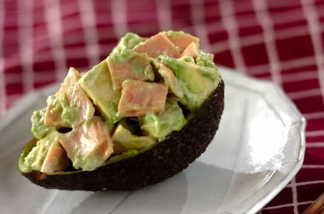 アボカドの皮はカップがわりに使えてとっても便利。レシピではハムが入っていますがアボカドだけでもOK。マヨしょうゆとアボカドがマッチする一品です。