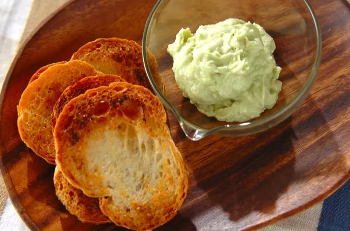 熟れたアボカドを使ったクリーミーなディップ。野菜や魚介類とも相性抜群。バゲットの代わりにトルティーヤを用意すればタコスのワカモレになりますね。