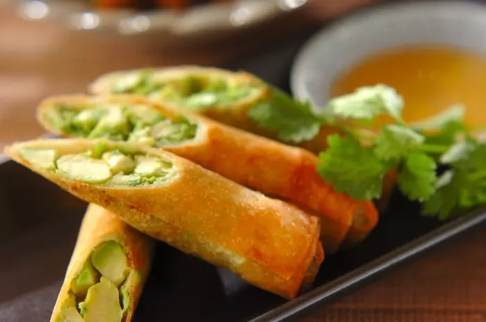 ナンプラーで和えたアボカドを春巻きの皮で巻いて揚げた一品は、スイートチリソースや辛子醤油につけて食べるとアボカドの甘さが引き立ちます。最高のおつまみに。