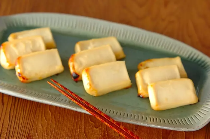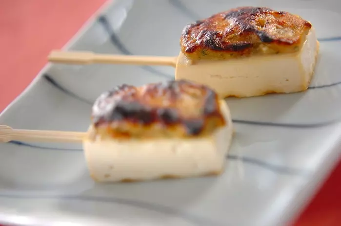西京みその田楽ソースを乗せ焦げ目が付くくらいに焼いた豆腐田楽。水分量が少ない木綿豆腐で作ると失敗なく作れます。お子さんのおやつにしても良いですね。