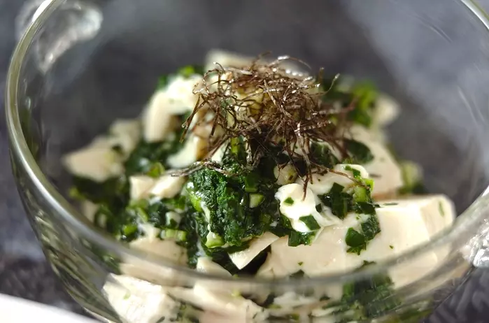 栄養価の高いモロヘイヤを、茹でて刻んで豆腐と合わせた身体に良い一品。ワサビを多めにするとお酒向きに。お子さんにはワサビなしで調整してくださいね。