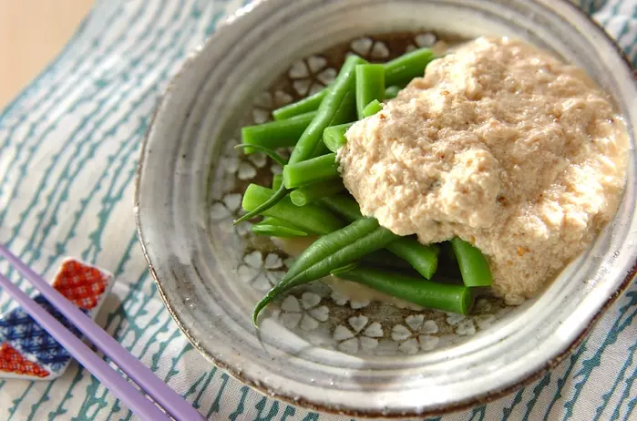 豆腐を裏ごしして作るなめらかなゴマソース。サヤインゲンと合わせてヘルシーに仕上げました。インゲン以外にニンジンや里芋など様々な野菜に合いますよ。