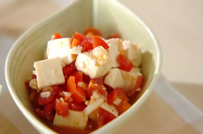 ビールのおつまみにおすすめなのが、プチトマトと玉ネギで作ったサルサソースで豆腐を和えたこの料理。92kcalで低糖質!良く冷やして食べてくださいね。