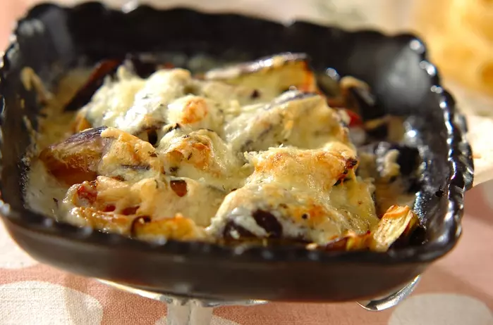 鶏ひき肉を白みそやしょうゆでそぼろにし、カボチャと大葉と一緒にドリアに仕上げました。和と洋をミックスした新しいレシピです。