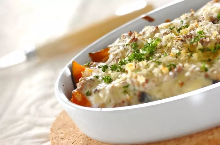 電子レンジで蒸したカボチャにひき肉入りのクリームソースをたっぷりかけ、オーブンでこんがり焼き上げます。市販のホワイトソースを使うと時短で作れます。